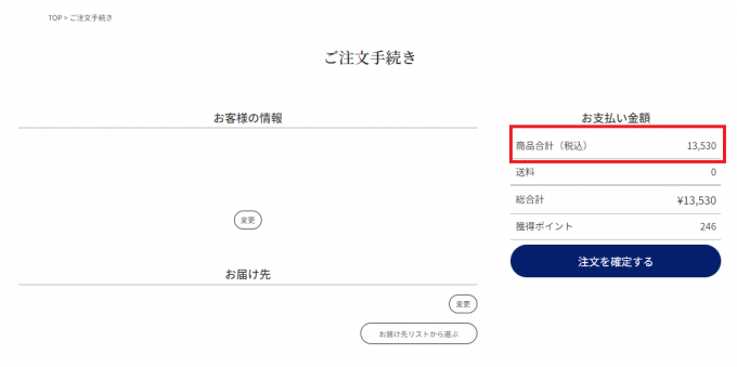 ※キャンペーン対象金額につきましては下記ご注文手続きの赤枠部分「商品合計(税込)の金額が13,000円以上」であることをご確認ください。
