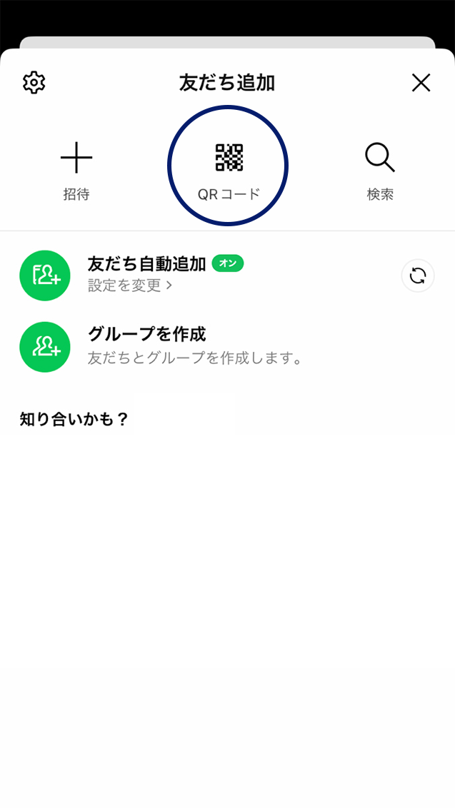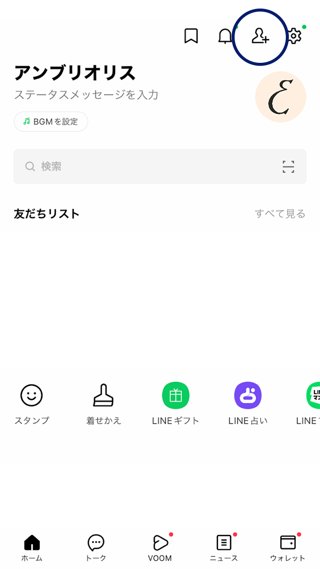 LINEアプリを起動し、ホーム画面の右上にある友だちの追加アイコンをタップ。