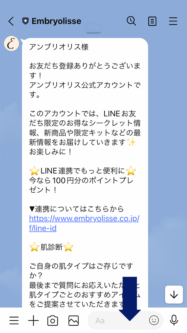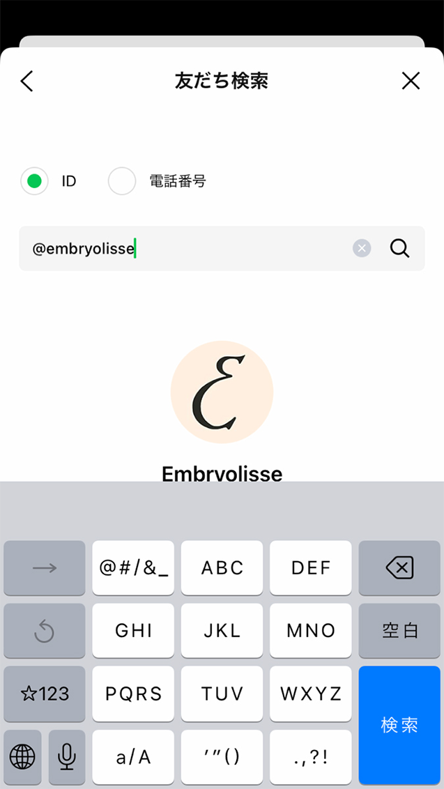 LINEアプリを起動し、ホーム画面の右上にある友だちの追加アイコンをタップし、そこから[検索]を選択して「@embryolisse」で検索して登録できます。