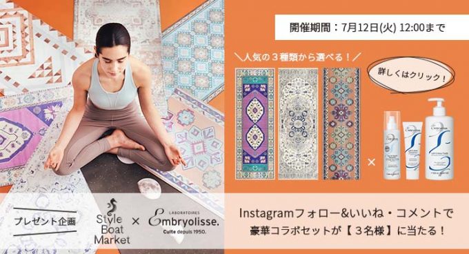 自由で解放されたヨガウェア&ヨガマットを提案する《Style Boat Market(@styleboatmarket) 》 と フランス発祥の自然な美しさのためにシンプルな処方のスキンケア製品を提案する《Embryolisse (@embryolisse_japan) 》の豪華コラボセットを【 3名様 】にプレゼントいたします。