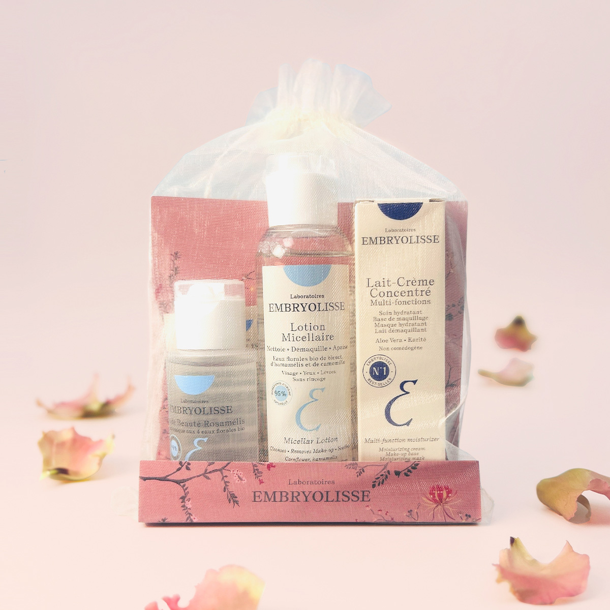 ロングセラーの保湿クリームをはじめ、ノンアルコール化粧水、クレンジング水、美容液がセットに。アンブリオリスらしいアイボリーのオーガンジー巾着にラッピングされた状態でお届けいたします。